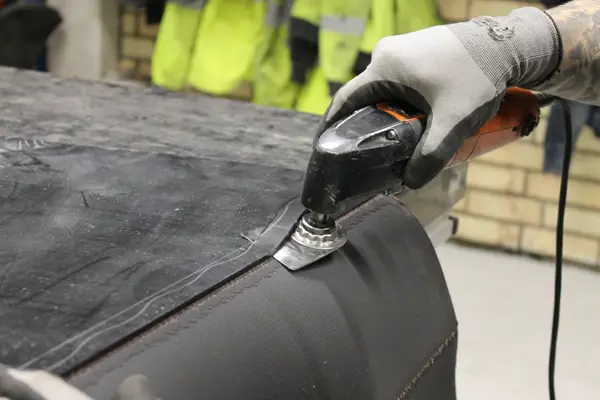 Att skarva ett transportband är ett hantverk. Våra certifierade servicetekniker har många års erfarenhet. Transportbanden mäts noggrant och skärs med precision för att skapa en nästan osynlig skarv som sedan vulkas ihop. Förberedande arbete utförs i våra verkstäder, skyddat från väder och vind. På det viset kan vi garantera att materialet är helt intakt och att serviceteknikerna får de bästa förutsättningarna som finns för att utföra det precisa arbetet.